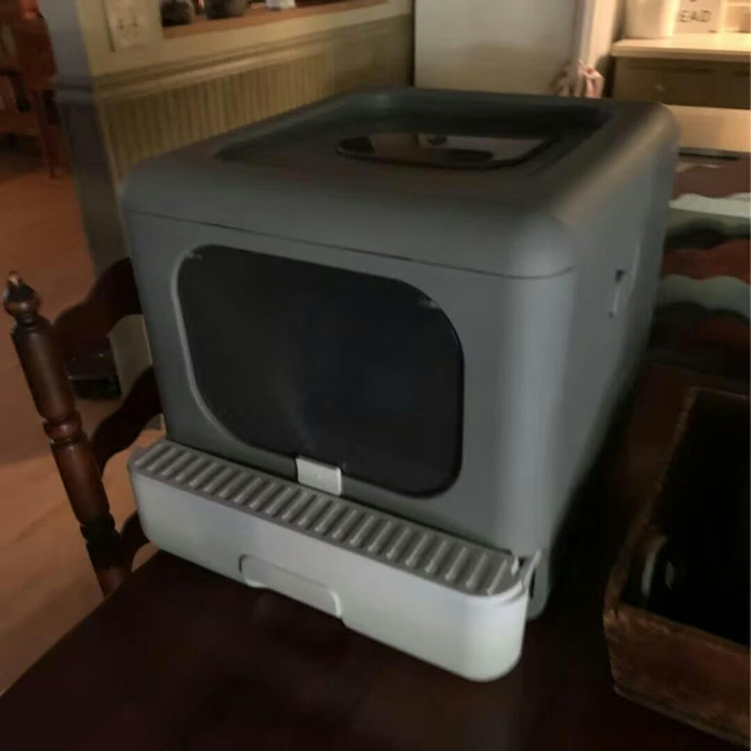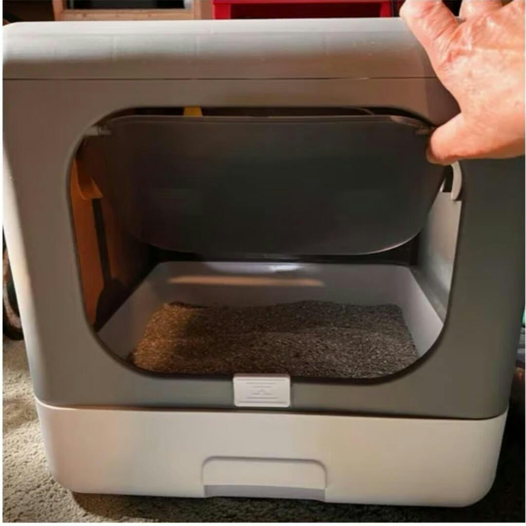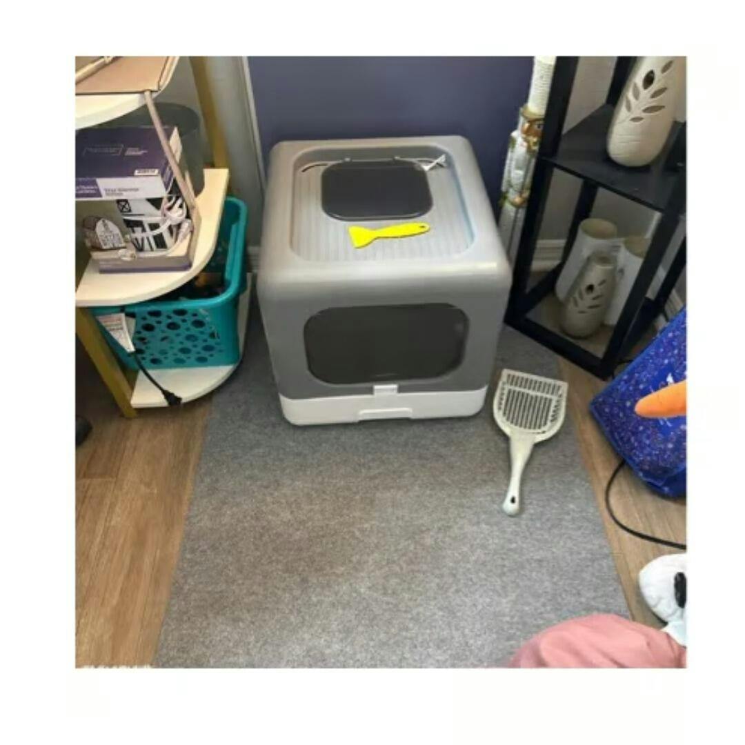 Bac à litière pliable à capuche, pelle de nettoyage, mousse filtrante anti-odeurs, mode d’emploi.