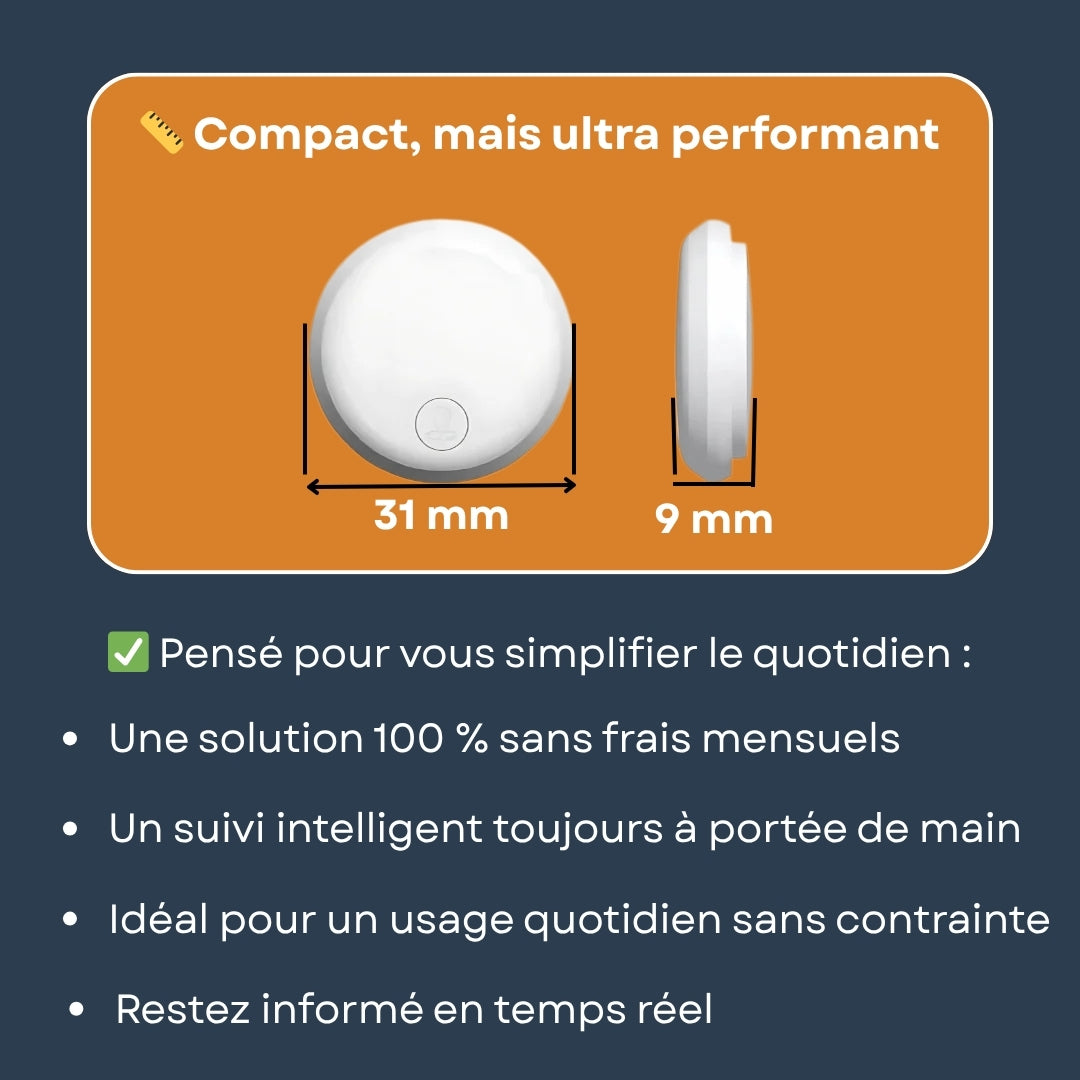 Avec seulement 31 mm de diamètre et 9 mm d’épaisseur, ce traceur GPS est l’un des plus compacts du marché. Sa petite taille ne réduit en rien sa puissance : il vous assure un suivi précis et en temps réel, directement relié à votre smartphone. Pensé pour simplifier votre quotidien, il est idéal pour un usage quotidien sans contrainte : que ce soit pour sécuriser un vélo, une voiture, un sac ou même suivre un enfant, il reste toujours à portée de main. Léger, discret et sans abonnement, il s’adapte à toutes vos situations et devient rapidement un indispensable de votre sécurité personnelle.