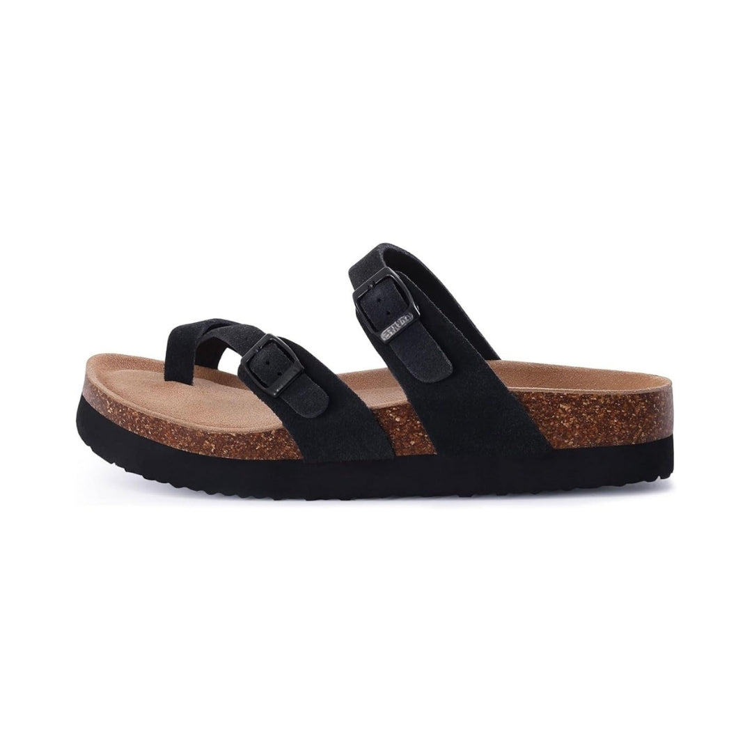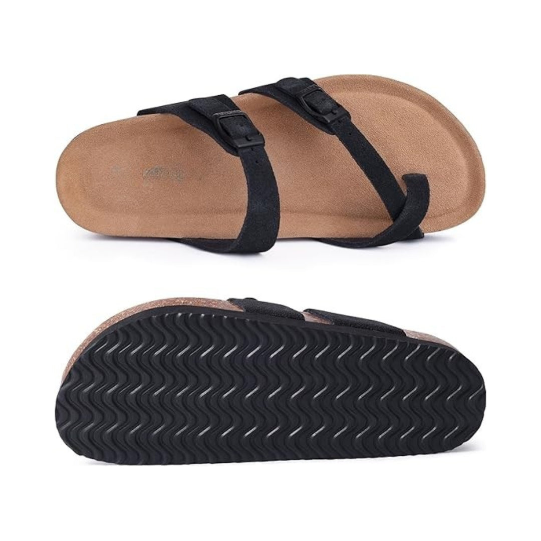 Dessus de la sandale : Réalisé en daim véritable, doux et résistant, pour une sensation agréable sur la peau et une finition élégante. Les deux boucles métalliques permettent un ajustement précis, s’adaptant à toutes les morphologies.