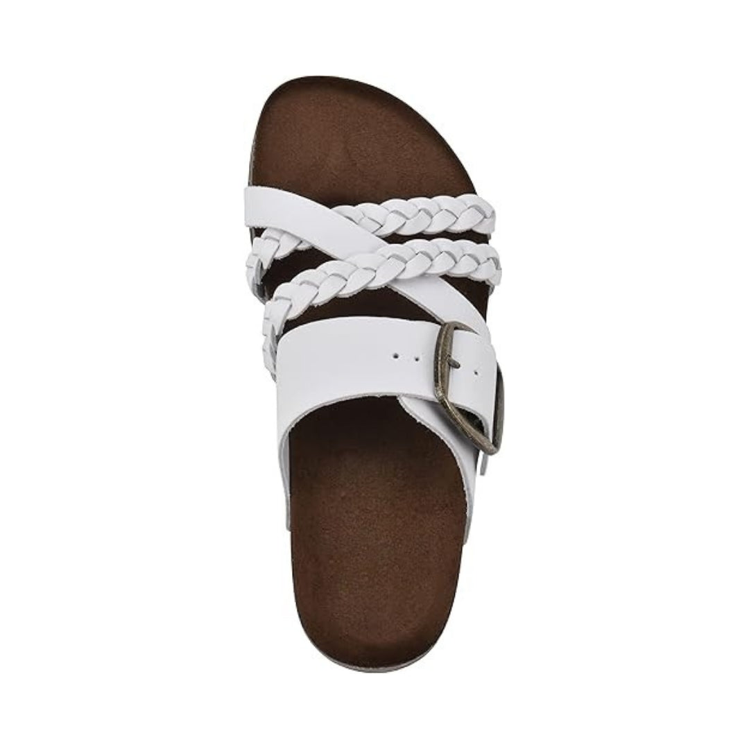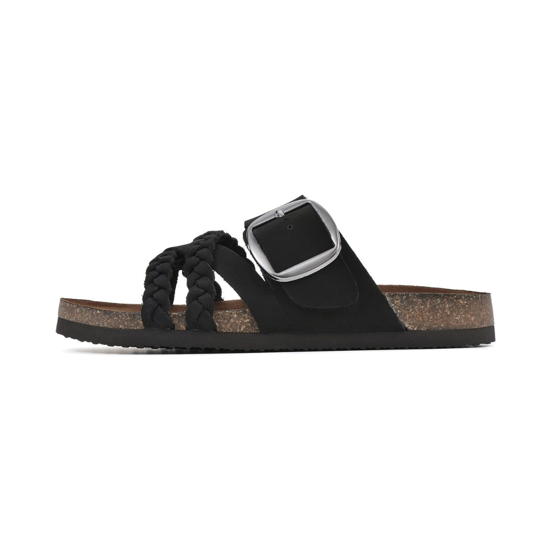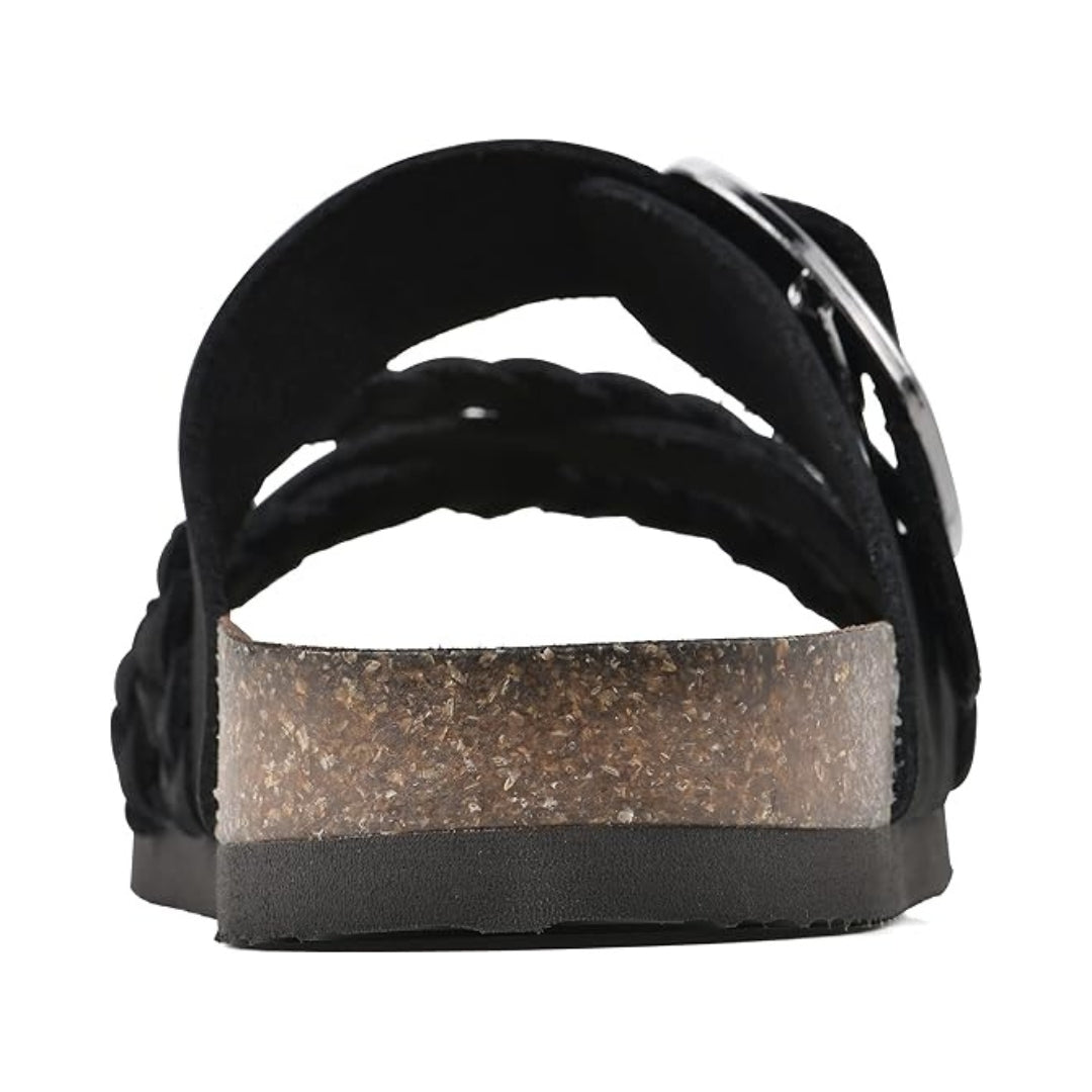Leur semelle intérieure profilée épouse la forme naturelle du pied pour offrir un soutien optimal, tandis que la large sangle tressée garantit un maintien sûr tout en ajoutant une touche de caractère. La boucle réglable permet d’ajuster la sandale à votre morphologie pour un confort sur mesure.