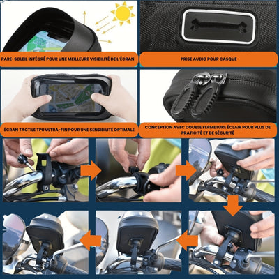Fabriqué à partir de matériaux durables et résistants, ce support moto pour téléphone protège efficacement votre appareil contre la pluie, la poussière et les éclaboussures. Grâce à sa coque étanche transparente et tactile, vous pouvez utiliser votre écran, GPS ou lecteur de musique sans retirer le téléphone de son support.